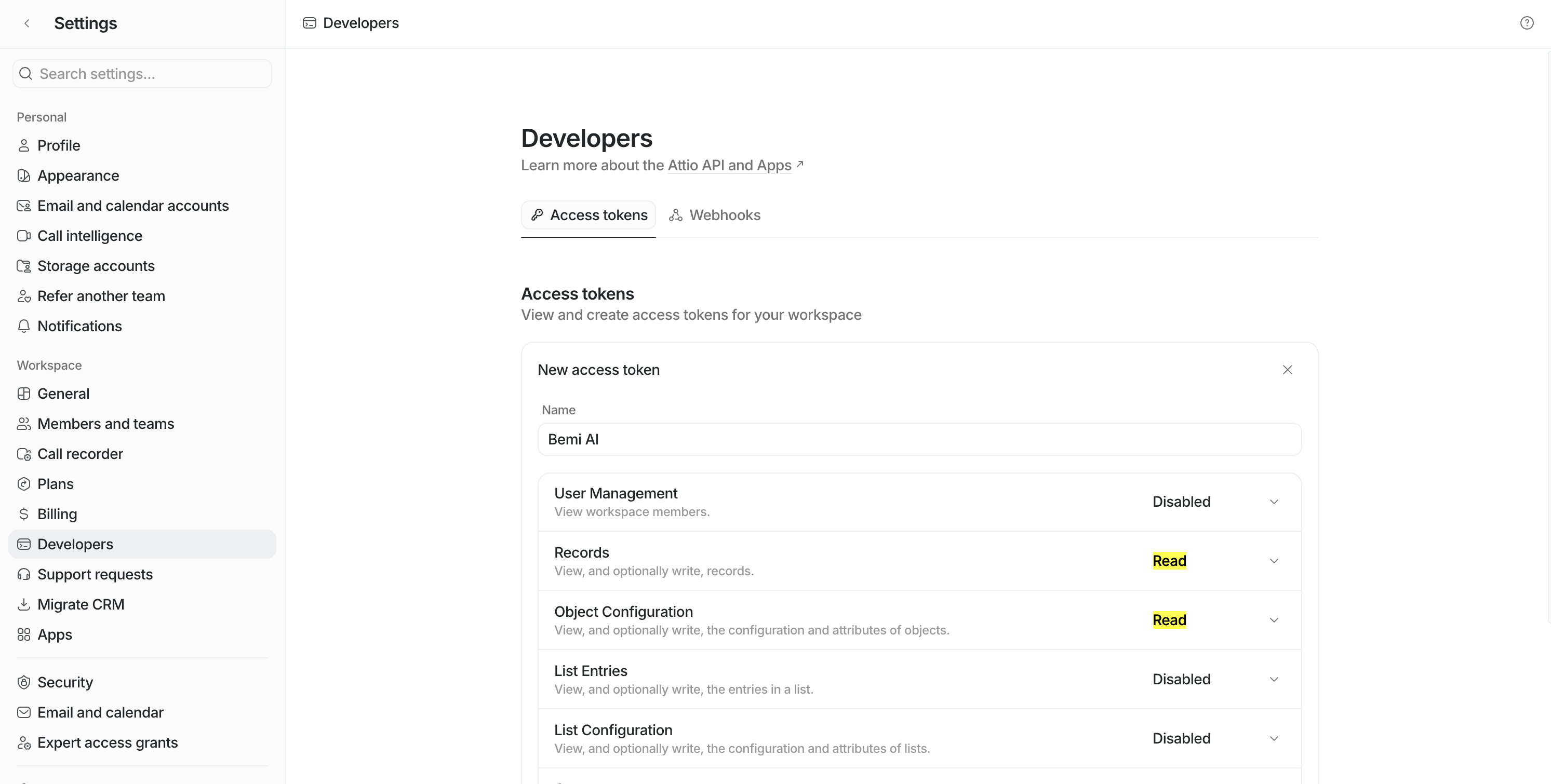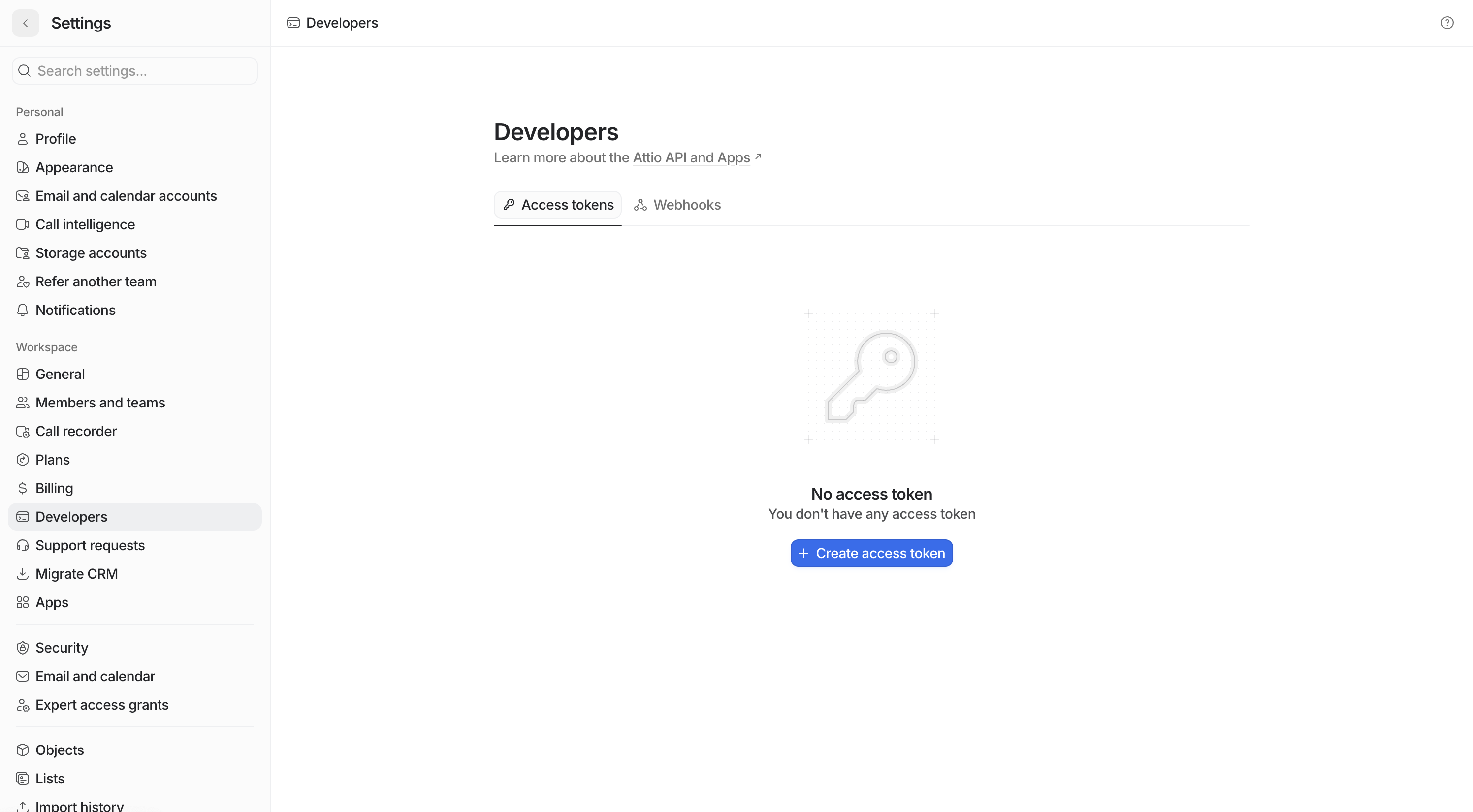 Simply paste the generated Access Token into the Attio connection setup form on Telio.
